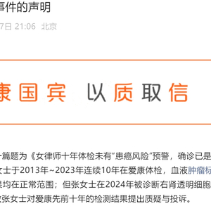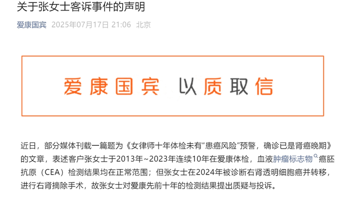 近日,部分媒体刊载一篇题为《女律师十年体检未有“患癌风险”预警,确诊已是肾癌晚期》的文章,表述客户张女士于2013年~2023年连续10年在爱康体检,血液肿瘤标志物癌胚抗原(CEA)检测结果均在正常范围;但张女士在2024年被诊断右肾透明细胞癌并转移,进行右肾摘除手术,故张女士对爱康先前十年的检测结果提出质疑与投诉。