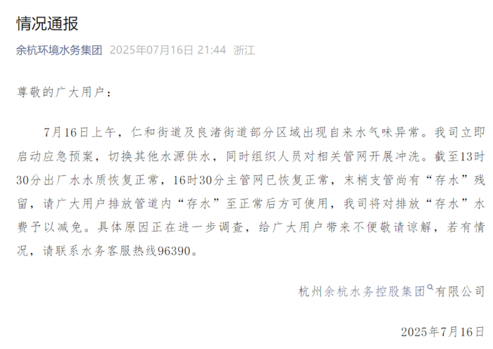 7月16日21时44分,余杭环境水务公众号发布了情况通报。通报中提到:“ 7月16日上午,仁和街道及良渚街道部分区域出现自来水气味异常。我司立即启动应急预案,切换其他水源供水,同时组织人员对相关管网开展冲洗。截至13时30分出厂水水质恢复正常,16时30分主管网已恢复正常,末梢支管尚有‘存水’残留,请广大用户排放管道内‘存水’至正常后方可使用,我司将对排放‘存水’水费予以减免。具体原因正在进一步调查。”