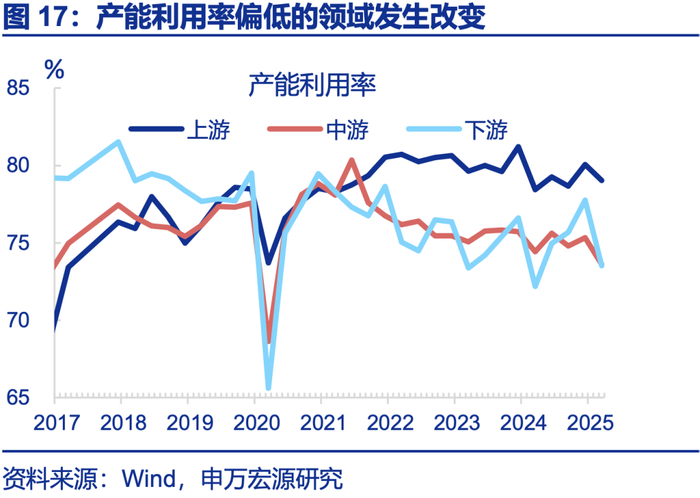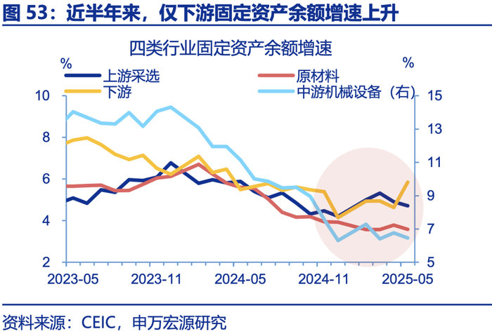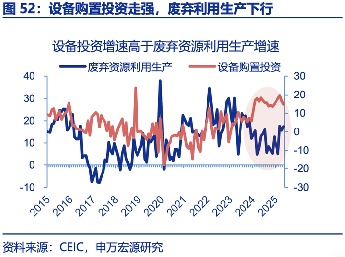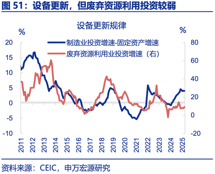 下游行业存在设备更新“监管套利”问题,购置新设备、保留老设备,淘汰老设备或是“反内卷”重要手段,对就业的负面影响也较小。自2024年初以来,设备投资明显走强,但与历史不同的是,本轮行业购置新设备后、并未同等幅度淘汰老设备,而是保留老设备、内卷出口。数据上,2024年以来设备购置投资增速冲高至近20%,而处理老设备的废弃资源利用生产增速由20%下滑至10%左右;下游是今年来唯一出现固定资产余额增速上升的领域,反映购置新设备、保留老设备。强制淘汰老设备具有重要意义,且由于新设备已购置,老设备的减少并不会明显影响生产和就业。