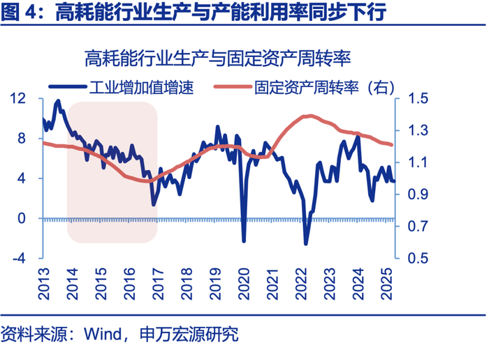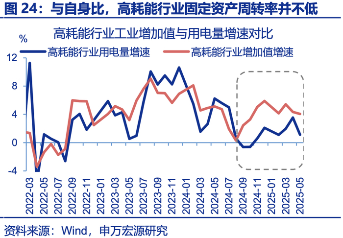 反内卷强调“推动落后产能有序退出”、但并非局限于高耗能行业;高耗能行业已集中大规模改造,“落后产能”并不如供给侧改革时显著。2020年以来,以钢铁为代表的高耗能行业产能增速处于0左右,固定资产投资增速一度达到20%以上,反映产能大规模节能改造影响,目前高耗能行业投资增速保持在6.3%的较高水平;从固定资产周转率来看,近年高耗能行业周转率虽在下降,但仍处于历史中位数水平;从高耗能行业用电量与生产关系来看,自2024年中以来,高耗能行业增加值增速(4%)罕见地持续高于用电量增速(1%),也反映产能更新后能耗降低的现象。