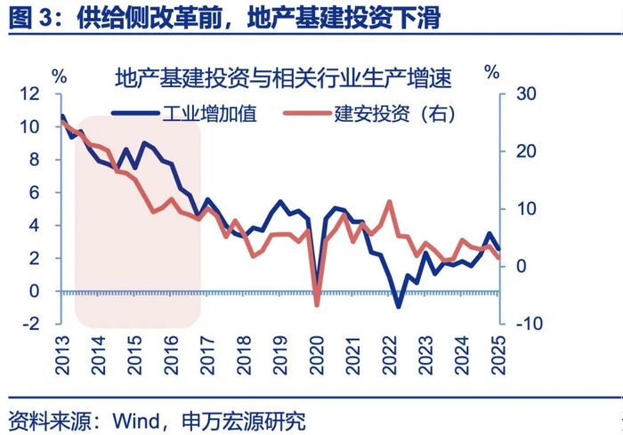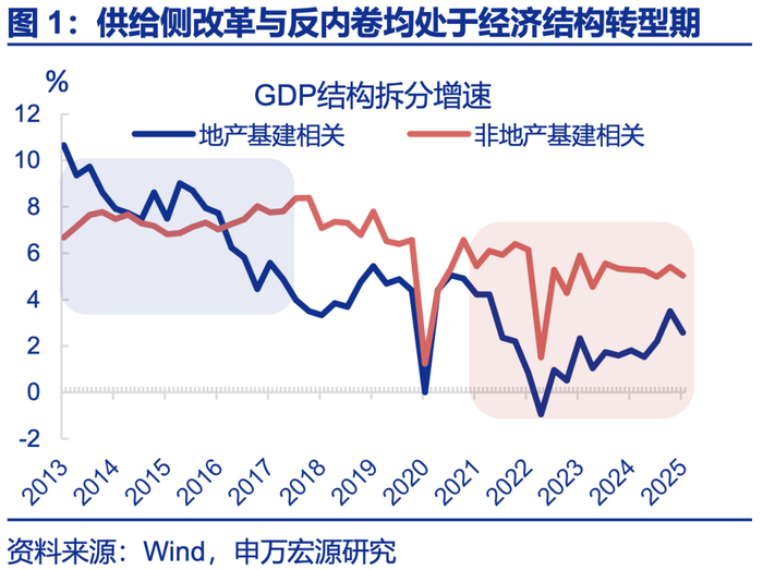 反内卷与供给侧改革治理产能过剩,均处于相似的经济结构转型期,且均是供给问题,市场易产生“类比心理”。反内卷与供给侧改革均经历传统动能下行、新动能稳定的结构转型期。2013-2015年,地产基建相关行业增速由10%以上下滑至6%以下,其他行业增速稳定于7%~8%附近;工业企业利润均因成本压力明显走弱。