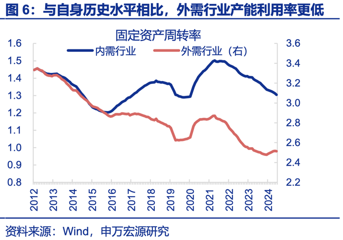 需求成因不同:“过剩”是需求下滑、供给被动过剩,“内卷”是需求强劲领域供给主动增加。供给侧改革前,地产基建需求走弱,高耗能行业产能被动过剩;当下外需表现更强,但外需行业固定资产周转率下滑至历史最低水平(2.6以下),内需行业固定资产周转率虽在下行,但仍处于历史中位数,外需行业比内需行业更卷;外卖等服务业(非贸易部门)不存在产能过剩问题、但也在内卷。