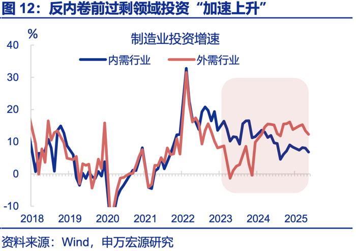 “反内卷”若要取得良效,并非如供给侧改革直接刺激过剩领域的需求,而是解决服务业等其他领域需求不足的问题,引导需求结构再平衡。供给侧改革针对供给过剩、需求不足问题,采取供给收缩(去产量、去产能)、刺激过剩领域需求(棚改货币化等)措施,提振物价。本轮反而是需求强的领域(外需行业、新兴行业)供给过剩、价格更低,反映企业主动降价现象,而出口、新兴领域需求较难通过政策直接刺激,且刺激过剩领域需求反而或加剧“内卷”。政策更重要的是引导需求结构再平衡,因为内卷的本质是需求结构分化太极致(外需强、内需弱)。