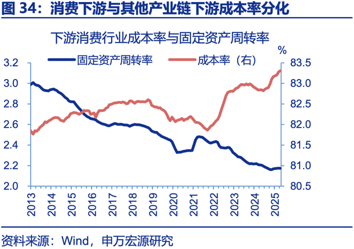 若上游价格大幅上升,下游将同时面临刚性成本、弹性成本的双重压力,不利于下游“反内卷”政策效果,部分中上游已在部署“保供稳价”。对下游成本率归因发现,下游成本率的涨幅均超出上游大宗价格上升传导的幅度,包括石化产业链下游、消费行业等。主因下游行业内卷、产能投资过多,形成刚性成本。数据上也表现为上述行业成本率与固定资产周转率高度反相关。如近三年消费行业固定资产周转率由2.5下滑至2.2的历史性低位,同期成本率由81.7%上升至83.4%的历史性高位;据测算,若钢铁、有色等金属价格上涨10%,将直接利空下游利润增速1.9个百分点。钾肥等化工行业近期出现价格异常上涨问题,政策已在部署“保供稳价”。