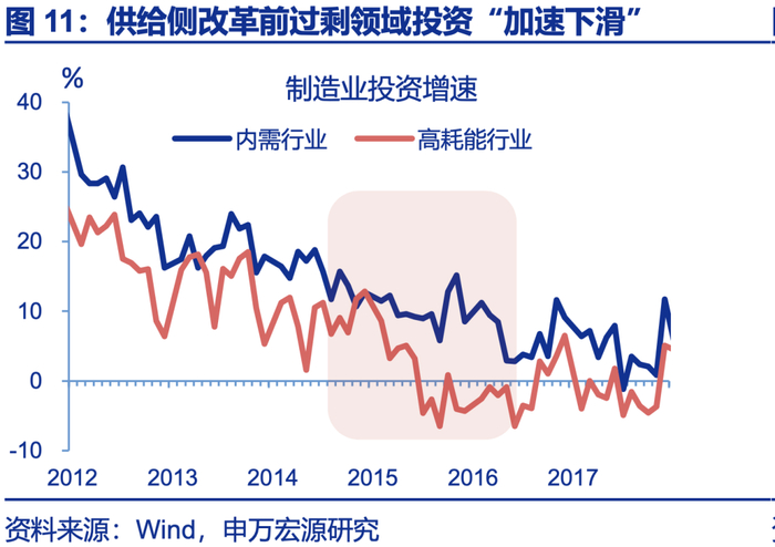 但供给侧改革面对的是需求下滑领域的供给过剩问题,地产基建投资走弱,导致高耗能行业产能被动过剩。2013-2015年的产能过剩,很大程度源于2008年“四万亿”刺激计划退坡后,以钢铁、水泥、煤炭为代表的高耗能行业面临明显的需求走弱问题。前期投资过度形成刚性产能,产能过剩问题显现。在此期间,高耗能行业生产增速由12%的高位下滑至4%左右(企业并未卷生产),固定资产周转率也由1.3左右,下滑至1左右,并由此触发供给侧改革政策的直接加码。