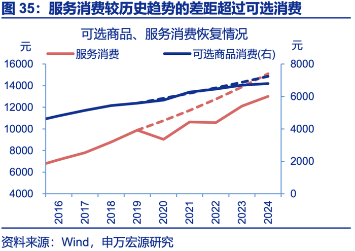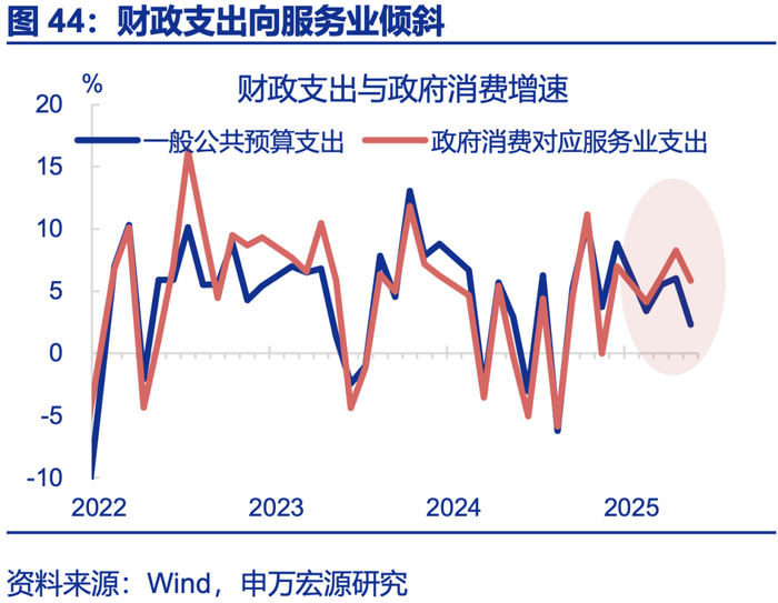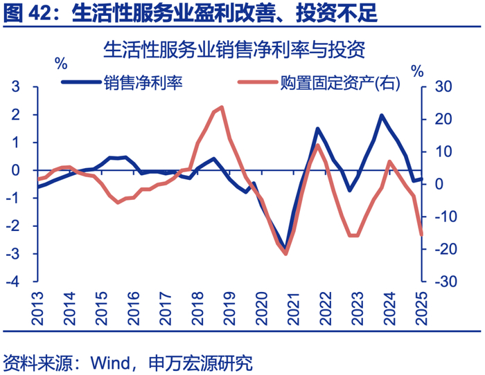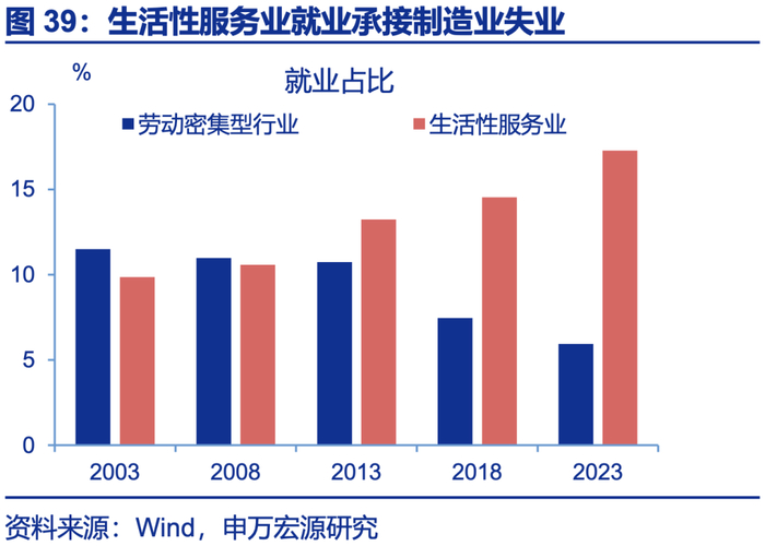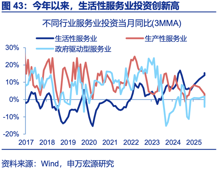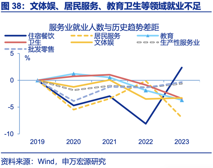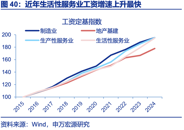 服务消费较潜在趋势恢复差3万亿,服务业就业恢复更是弱于需求,发展服务业也能反内卷、并承接制造业失业。近年来服务消费较历史趋势的缺口为3万亿左右;就业方面,制造业就业超潜在趋势、内卷明显,但服务业就业恢复弱于潜在趋势,甚至弱于服务消费需求,结构上居民服务、文体娱、教育、医疗等行业均面临就业不足问题,服务业存在供给缺口。因而近两年生活性服务业工资增速也最高(累计18.1%)。从体量上看,服务业就业也完全能承接制造业“反内卷”后的失业人口,还能起到就业结构“再平衡”的效果,服务业供需改善均利好反内卷。