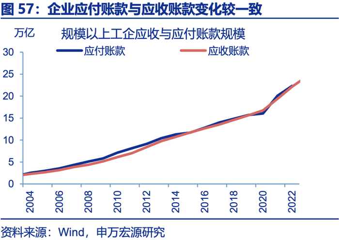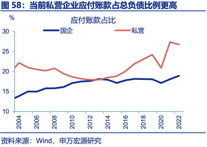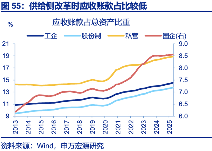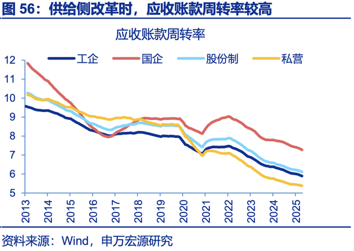 拖欠款项治理也是重要方向,供给侧改革时拖欠款项问题并不严重,目前款项拖欠问题较明显,尤其是民企应付账款占比大。观察应收账款占总资产比重,供给侧改革前,应收账款占比在11%左右,处于历史低位,但目前上升至15%左右,结构上私营企业占比最高(18.9%)。从应收账款周转率来看,供给侧改革时该指标读数处于9倍左右,但目前下降至6倍左右,处于历史最低水平,私营企业指标读数也最低。从应付账款占总负责比例看,供给侧改革时,私营企业应付账款占比下滑至18%左右。但目前大幅上升至26%,明显高于同期国有企业(18%)。民企内部内卷现象明显。