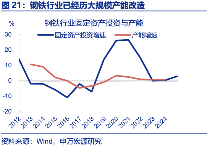 高耗能行业已完成产能集中改造,大部分传统落后产能并不落后。2020年以来,以钢铁为代表的高耗能行业产能增速处于0左右,固定资产投资增速却一度达20%以上,反映产能大规模节能改造;近两年,高耗能行业固定资产周转率下降,但仍处于历史中位数水平;2024年中以来,高耗能行业增加值增速(4%)罕见地持续高于用电量增速(1%),显示大规模产能改造后能耗已明显降低。