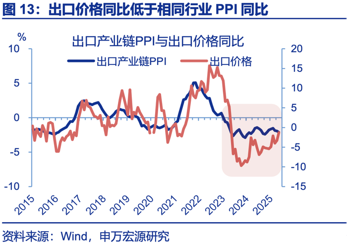 物价表现不同:“过剩”是企业因需求下滑跟随式降价,“内卷”是企业因需求强劲“降价无序竞争”。供给侧改革前,地产基建需求走弱,煤炭钢铁等PPI随之明显回落,相关行业制造业投资也下行;当下内卷领域,盈利偏弱而制造业投资大幅扩张,外需领域投资增速更高(13%)。出口商品价格(同比-5%以下)甚至低于相同商品内销价格(同比-1%~-2.5%之间),反映主动降价内卷。