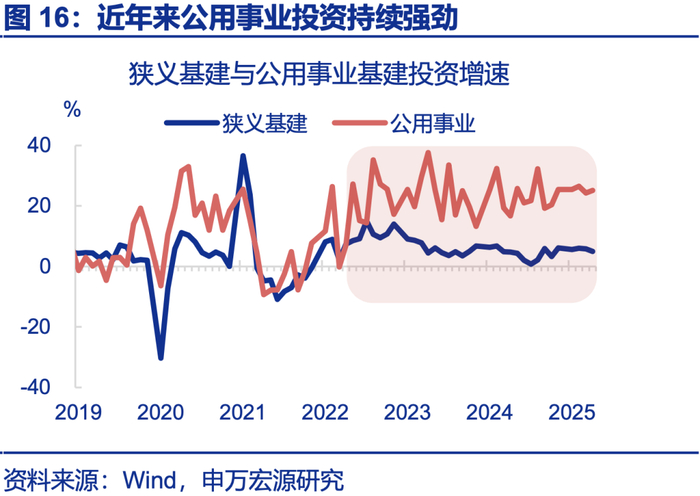 供给侧改革时过剩领域因需求不足被动降价(供给减少),本轮内卷反而是需求强的领域(外需行业、新兴行业)价格更低,反映主动内卷(供给增加)。2023年以来,出口明显走强,但出口价格同比一度下滑近25个百分点,大部分时间位于-5%以下;出口商品价格甚至低于相同商品内销价格,出口产业链产品内销+外销价格同比处于-1%~-2.5%之间(外销价格同比为-5%以下);下游主动降价现象更突出,石化产业链下游PPI史上首次较上游价格“超跌”;其他过剩领域如光伏的需求也相对旺盛,公用事业基建近三年增速持续处于20%以上,明显高于狭义基建增速水平。