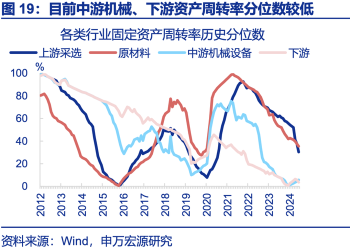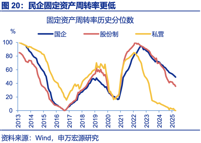 供给问题不同:供给侧改革前上中游、国企供给过剩,本轮反内卷是中下游、民企更内卷。观察固定资产周转率历史分位数,2016年上游采选、原材料下行至历史最低位,目前处于历史分位数30%~40%附近。中游机械设备和下游在2016年处于历史分位数40%~60%,但现在处于历史最低位;从企业属性看,当前民企固定资产周转率处于历史最低水平,国企处于历史中位数附近(50%)。