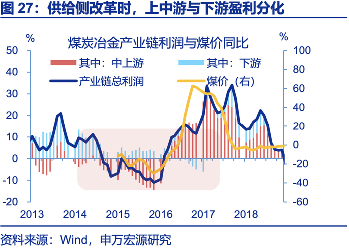 供给侧改革时过剩问题集中在中上游,收紧中上游供给可改善价格与盈利,但下游利润也明显走弱。供给侧改革大幅推升煤炭与钢铁价格,相应带来煤炭冶金产业链中上游利润明显改善,增速由2015年底-34.8%大幅上升至2017年3月131.3%,此后持续保持两位数正增长。但原材料价格上升相应带来下游成本压力,虽然下游PPI也伴随供给成本传导明显上升,但下游利润增速明显下降,同期由5.7%下滑至-8.2%;进一步拆分利润率结构,钢价与冶金产业链下游行业成本率呈现明显的正相关现象