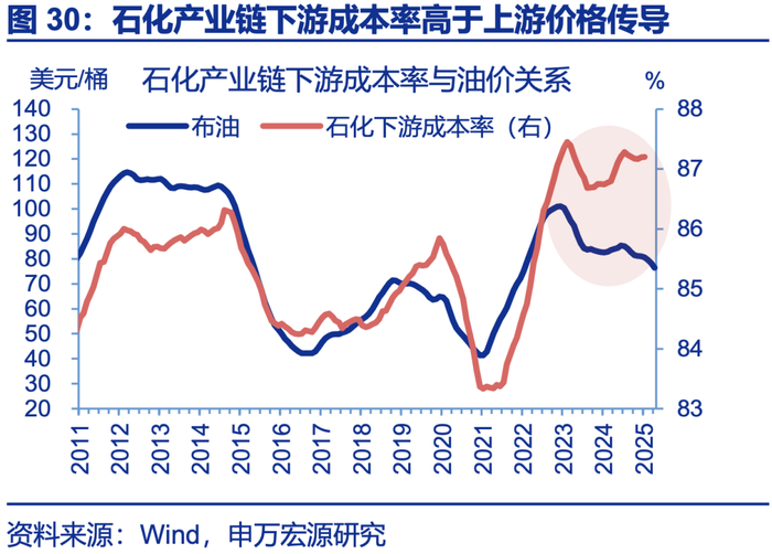 本轮内卷的是中下游,中下游成本压力比上游更大。当前工业企业利润表现持续低迷,主因成本压力上升(测算近两年成本压力拖累利润增速8个百分点)。拆分行业结构,本轮成本压力更集中于中下游,在石油化工产业链、煤炭产业链、消费产业三大链条中,中下游成本率均处于历史性高位。譬如,石油化工产业链下游成本率目前高达87%左右,处于历史最高水平,也高于油价的传导幅度。消费下游成本率达到88%、也是历史性新高。