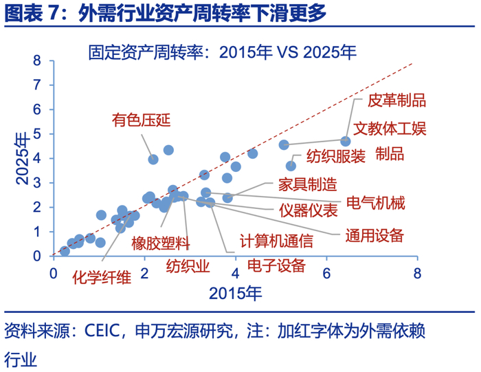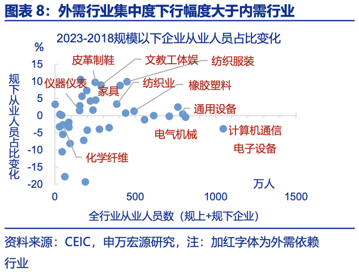 当下是需求偏强领域主动增加供给的问题,外需行业内卷反而比内需行业更明显,且外卖等服务业(非贸易部门)不存在产能过剩问题、但也在内卷。观察固定资产周转率,内卷更明显的是需求更好的外需领域。2022年以来,外需行业固定资产周转率由2.8下滑至2.6以下,处于历史最低水平附近。相比之下,内需行业固定资产周转率虽然也回落至1.3左右,处于自身历史中位数附近;从细分行业看,纺织服装、玩具、家具、计算机通信电子设备等固定资产周转率下滑明显;从业人员方面,外需依赖行业规模以下从业人员占比明显上升,也显示行业集中度下降、内卷程度加深的现象。