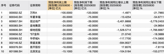 此外,信达地产、绿地控股、金科股份、华侨城、荣盛发展、首开股份和东辰实业的上半年预计亏损额上限亦进入前十。