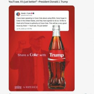 “我正在跟可口可乐公司讨论在美国销售的可乐中使用真的蔗糖。”特朗普在社交媒体平台“真实社交”发文,并特意用大写字母拼写“真的”一词以示强调。他写道:“他们(可口可乐公司)已经同意这样做……这将是一种非常好的做法——你们会看到的。这样就是更好!”