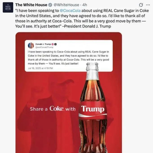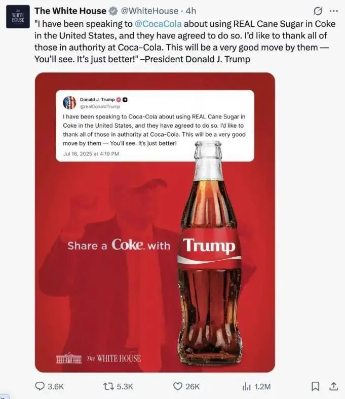 当地时间16日,美国总统特朗普表示,在他与可口可乐公司沟通后,后者已同意在美国市场的饮料中使用甘蔗糖。