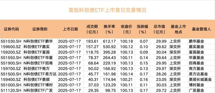 与此同时,在机构投资者热烈追捧下,科创债ETF产品交投活跃,首日总成交额突破800亿元,部分产品换手率高达6倍。