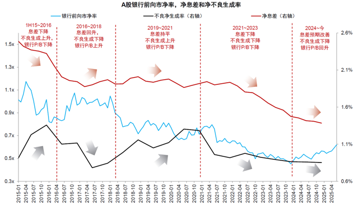 图表1:本轮银行股上涨,表现为不良净生成率的改善,资产负债表更加健康,估值提升对应估值模型风险溢价因素的快速改善