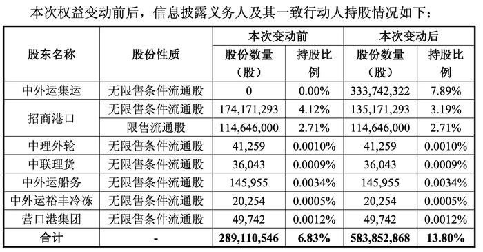 此外,中外运集运的一致行动人招商港口、湛江中理外轮理货有限公司、 汕头中联理货有限公司、 广东中外运船务有限公司、 厦门中外运裕丰冷冻工程有限公司、 营口港务集团有限公司合并持有安通控股5.91%的股份,因此中外运集运预计和其一致性人共计持有安通控股13.8%的股份。