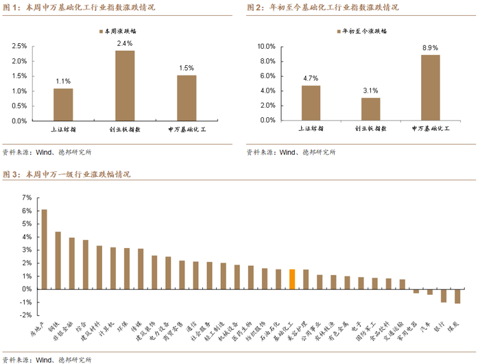 本周基础化工板块表现好于大盘。根据Wind,本周(7/4-7/11)上证综指涨跌幅为+1.1%,创业板指数涨跌幅为+2.4%;申万基础化工行业指数涨跌幅为+1.5%,在全部31个行业板块中位列第19位,跑赢上证综指0.4个百分点,跑输创业板指数0.8个百分点。年初至今,上证综指涨跌幅为+4.7%,创业板指数涨跌幅为+3.1%;申万基础化工行业指数涨跌幅为+8.9%,跑赢上证综指4.2个百分点,跑赢创业板指数5.8个百分点。