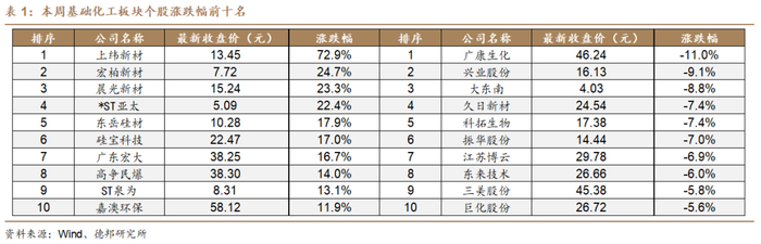 在基础化工板块424只股票中,本周298只股票上涨,123只股票下跌,3只股票持平。本周个股涨幅前十名分别为:上纬新材(+72.9%)、宏柏新材(+24.7%)、晨光新材(+23.3%)、*ST亚太(+22.4%)、东岳硅材(+17.9%)、硅宝科技(+17%)、广东宏大(+16.7%)、高争民爆(+14%)、ST泉为(+13.1%)、嘉澳环保(+11.9%)。本周个股跌幅前十名分别为:广康生化(-11%)、兴业股份(-9.1%)、大东南(-8.8%)、久日新材(-7.4%)、科拓生物(-7.4%)、振华股份(-7%)、江苏博云(-6.9%)、东来技术(-6%)、三美股份(-5.8%)、巨化股份(-5.6%)。