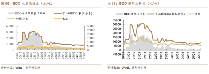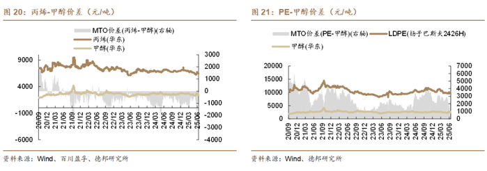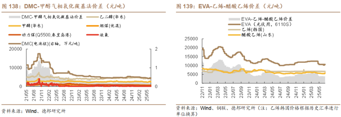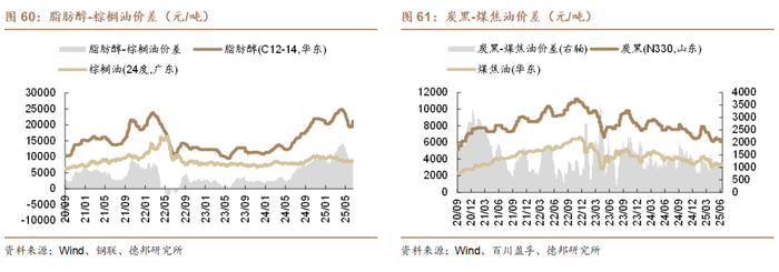 本周化工品价差涨幅前十名为:二甲胺-甲醇-液氨价差(+894元/吨)、DMF-甲醇-液氨价差(+379元/吨)、顺酐-碳四原料气价差(+112元/吨)、尿素-LNG价差(+43元/吨)、电石法醋酸乙烯价差(+267元/吨)、MTO价差(乙烯-甲醇)(+192元/吨)、苯乙烯-纯苯-乙烯价差(+226元/吨)、PET瓶级-PTA-MEG价差(+69元/吨)、乙烯法醋酸乙烯价差(+273元/吨)、脂肪醇-棕榈油价差(+1465元/吨)。