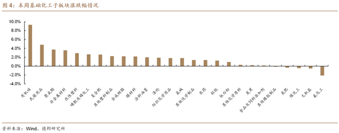 细分板块看,在基础化工26个子板块中,21个子板块上涨,5个子板块下跌。本周子板块涨跌幅前五名分别为:有机硅(+9.3%)、民爆用品(+4.8%)、聚氨酯(+3.7%)、非金属材料(+3.6%)、改性塑料(+2.9%);本周子板块涨跌幅后五名分别为:氟化工(-2.1%)、无机盐(-0.5%)、煤化工(-0.4%)、氮肥(-0.4%)、其他橡胶制品(-0.1%)。