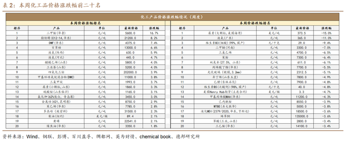 本周化工品价格跌幅前十名为:尿素(大颗粒,美国海湾)(-15%)、液氧(广东)(-11%)、维生素B3(烟酸)(99%,国产)(-9.4%)、二甲醚(河南)(-7%)、三氯乙烯(-6.5%)、苯胺(-6.4%)、双氧水(27.5%,山东)(-6.1%)、丙烯酸丁酯(华东)(-5.5%)、光伏玻璃(镀膜,3.2mm)(-5.1%)、异丁烯(山东玉皇)(-4.9%)。