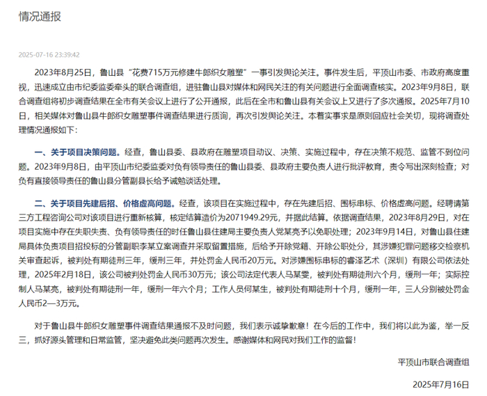 7月16日晚,河南省平顶山市联合调查组就“鲁山县花费715万元修建牛郎织女雕塑”一事发布情况通报。