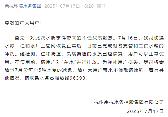 ●“小区自来水发臭”,水务公水务公司致歉:给予每户5吨水费减免
