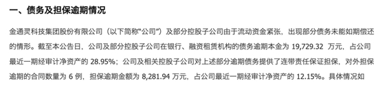 由于公司及部分控股子公司由于流动资金紧张,出现部分债务未能如期偿还的情形,截至5月24日,公司及部分控股子公司在银行、融资租赁机构的债务逾期本金为1.97亿元,占公司最近一期经审计净资产的28.95%;公司及相关控股子公司对上述部分逾期债务提供了连带责任保证担保,对外担保逾期的合同数量为6例,担保逾期金额为8281.94万元,占公司最近一期经审计净资产的12.15%。