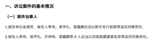 根据起诉书,因连续六年财务造假,金通灵和公司时任董事长兼总经理季伟、时任财务总监兼董事会秘书袁学礼、监事及财务部部长冒鑫鹏应当以欺诈发行股票罪追究刑事责任,前述三名负责人及总经理助理许坤明等共计6人应当以违规披露重要信息罪追究刑事责任。