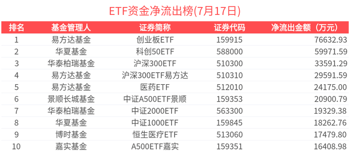 净流出金额超1亿元的有23只,创业板ETF(159915.SZ)、科创50ETF(588000.SH)、沪深300ETF(510300.SH)、沪深300ETF易方达(510310.SH)、医药ETF(512010.SH)资金显著流出,分别净流出7.66亿元、6.00亿元、3.36亿元、2.96亿元、2.42亿元(净赎回份额*单位净值)。