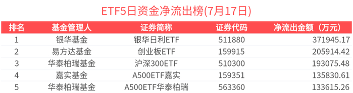 近5天累计净流出超过1亿元的有102只,金额居前的为银华日利ETF、创业板ETF、沪深300ETF、A500ETF嘉实、A500ETF华泰柏瑞等,分别净流出37.19亿元、20.59亿元、19.31亿元、13.58亿元、13.36亿元。其中,银华日利ETF近5天资金大幅净流出,基金规模快速下降至673.81亿元。