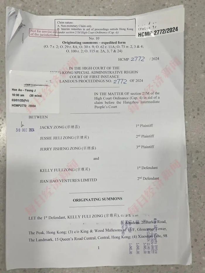 从香港高等法院的文书来看,早在2024年12月,宗继昌等三人就已申请针对宗馥莉的临时禁令,要求宗馥莉、Jian Hao Ventures Limited不得自行或通过代理人等任何方式处置、处理或降低在香港汇丰银行以第二被告人Jian Hao Ventures Limited名义开立的账户中的任何资产,也不得处置或减少自2024年2月2日以来存于该汇丰账户中的任何资产的替代物或可追踪收益。