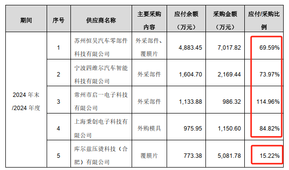 同时需要注意的是,标的公司还存在多个供应商的应付款项占整体采购规模比例畸高的异常情况。问询函回复显示,报告期内标的公司前五大供应商的账期在30天-90天之间。同时,标的公司各期第四季度的营收占比分别为26.05%、30.69%,也并不存在第四季度营收占比过高的情况。但令人极为诧异的是,标的公司应付账款占整体采购规模的比例却出现了明显的畸高情况。2024年,标的公司向供应商苏州恒吴汽车零部件科技有限公司购买外采部件、覆膜片共计金额为7,017.82万元,而截至2024年底其对应的应付账款余额则高达4,883.45万元,该供应商应付账款占整体采购规模的比例达69.59%。