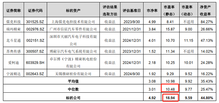 市场法测算方面,就其评估结果来看,标的公司的静态市盈率也显著高于近年来可比交易案例的平均值水平。问询函回复显示,近年来同行业可比交易的静态市盈率平均值为10.98,而反观此次交易标的公司的静态市盈率则高达18.94,大幅高于可比交易平均值水平超七成之多。对此,上市公司则解释为标的公司近年业务处于高速发展状态,其2024年实际完成净利润比2023年增长65.42%。而正如上文所分析,标的公司未来预测期内营业收入的增速不但预计将断崖式降低,而且其预测2025年公司净利润还将较2024年实际数略有降低之下,上市公司所谓的标的公司高速发展状态于未来的可持续性明显较低,进而支撑其高估值逻辑的合理性同样可能较低。