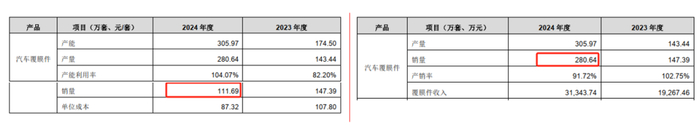 需要特别注意的是,上市公司于问询函回复中所披露的2024年标的公司覆膜件产品销量数据还存在前后显著不一致的情况,也进一步加深了我们对于标的公司所披露经营数据准确性与真实性的质疑。如下图所示,问询函回复中两处涉及2024年标的公司覆膜件产品销量数据分别显示为111.69万套、280.64万套,两者披露数据之间相差悬殊。