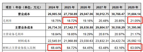其次,评估机构所预计标的公司预测期内毛利率水平长期持续提升的合理性同样存疑。2029年,评估机构预计标的公司的综合毛利率水平将持续增长至21.05%,较2024年实际毛利率预计仍能实现2.72个百分点提升。但就成本端来看,如前述所分析,标的公司目前覆膜件产品单位成本大幅降低的合理性本就可能不高,而其预计2029年标的公司材料成本占主营业务收入比例还0将持续下降至63.00%,较2024年68.44%的预计比例减少达5.44个百分点,同时叠加下游客户年降定价政策的影响之下,评估机构所预计未来标的公司材料成本占主营业务收入比例仍然能够实现持续显著降低的合理性高度存疑。基于以上分析,收益法下评估机构所预计标的公司未来的经营利润测算数据可能过于乐观,进而导致其股权评估价值或被高估。