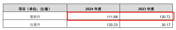 且就毛利率动因分析,从销售价格方面来看,标的公司覆膜件产品的销售单价于2024年还呈现显著降低态势,其平均销售单价为111.68元/套,较2023年降低达14.57%。而其销售单价下降的幅度不但与上市公司所表示的,标的公司产品销售价格一般在3%至5%左右的年降比例难以较好匹配的同时,也与公司该产品毛利率的显著提升形成了极为鲜明的对比。