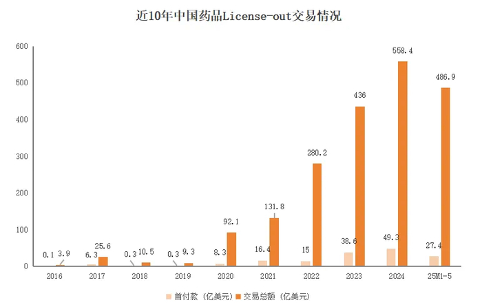 今年以来License-out交易的数量与金额明显增加,据统计,1-5月中国药品领域发生57笔License-out交易,同比增长超20%,总交易金额达486.9亿美元,接近2024全年水平(558.4亿美元),同时,像三生制药、石药集团等龙头药企都开出超50亿美元的BD大单,创新能力获国际认可。