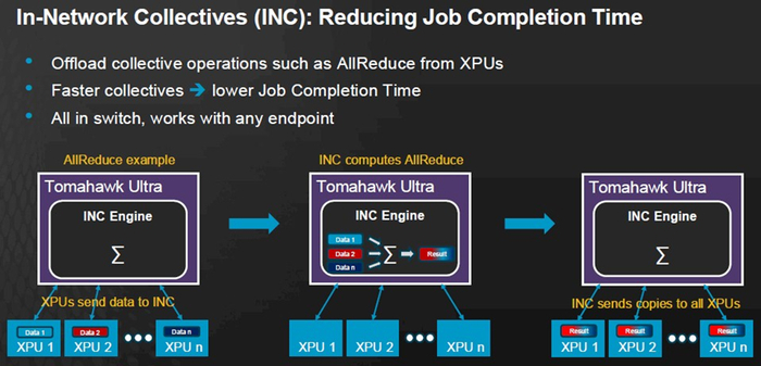 那么,博通是如何凭借Tomahawk Ultra成为InfiniBand杀手的呢?部分原因是采用了一些早期加入Ultra以太网联盟的技术,另一项技术则是将以太网数据包报头压缩到很早以前,以便它们能够更快地穿透交换机——但这样做不会破坏以太网兼容性。除此之外,博通还添加了类似于InfiniBand长期以来所拥有的网络内集体操作,以便在网络中执行某些类型的HPC和AI操作,而不是在端点执行。