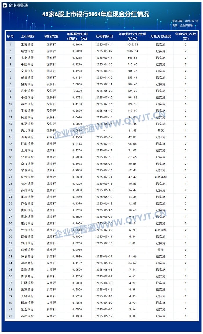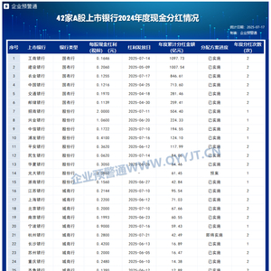 42家A股上市银行2024年度“红包”正持续发放中。据企业预警通统计,截至目前,38家上市银行已完成2024年年度A股分红派息;杭州银行、兰州银行即将实施分红;光大银行、成都银行的分红方案则已通过董事会预案,静待落地。