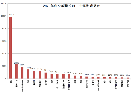 我们发现,当前我国期货品种交易活力呈现分化。从成交量增长上看,烧碱期货以 960% 的超高增幅领跑,焦煤、对二甲苯PX等品种亦有显著增长,反映出部分工业品受供需格局、政策预期等因素驱动,交易热度飙升 。如烧碱,或因行业产能调整、下游需求变动,引发市场对其价格波动的关注与交易博弈。成交额增长上,烧碱同样表现突出,991% 的增幅凸显其价格与成交量协同放大,对二甲苯、30 年期国债期货等跟进,体现工业品与金融期货品种均有资金聚焦,国债期货受宏观经济预期、利率走势影响,交易价值被挖掘。