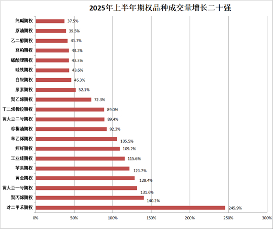 2025 年上半年期权品种中,对二甲苯期权以 245.9% 的成交量增幅领衔,聚丙烯期权、黄大豆一号期权等亦有可观增长。这表明随着市场发展,企业与投资者利用期权工具管理风险需求提升,对二甲苯等品种因现货市场波动、套保需求释放,推动期权交易活跃,反映期权市场在服务产业、丰富风险管理手段上持续进阶。