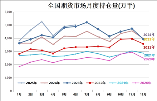 2020-2025年期货市场月末持仓量各月呈现明显波动特征。2020年2月-3月上升,4-6月稳定增长,7月略降,8月回升,9-10月回落,11-12月大幅攀升,年末增长显著。2021年2月下降,3月猛增,4-6月回落震荡,7-9月回升,10月大降和12月回落,波动剧烈,3月、11月为高峰。2022年2月微降,3月升4月回落,5-9月回升,10-12月逐步回落,呈先扬后抑。2023年1-4月逐步上升,5-6月微幅波动,7-8月连创新高,9-10月下降,11月反弹,12月回落。2024年是2月微降,3-4月上升,5月回落,6-9月增长,10月回落,11月反弹,12月回落。2025年1月-2月上升,3月回落,4-6月逐月回升。整体看,各年份持仓量月度波动显著,受市场供需、品种波动等影响,年中或特定月份(如3月、7-8月)易现持仓高峰,年末多调整,反映期货市场持仓规模随时间动态变化,交易活跃度与参与者预期不断博弈。