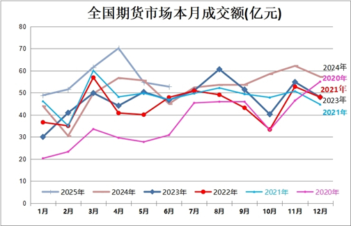 2020-2025年期货市场成交额各月呈现多样变化。2020年成交额年初低,后逐步抬升,年末有波动;2021年成交额走势有起伏,年中出现增长;2022年波动明显,部分月份有回落;2023年存在阶段性变化,3月后有调整;2024年整体呈一定上升后波动;2025年前期增长,后续有波动。各年份成交量与成交额趋势相互呼应,反映期货市场活跃度受市场环境等因素影响,月度间动态变化,年中或特定月份易现交易高峰,年末常伴随调整,展现期货市场交易的复杂性与波动性。