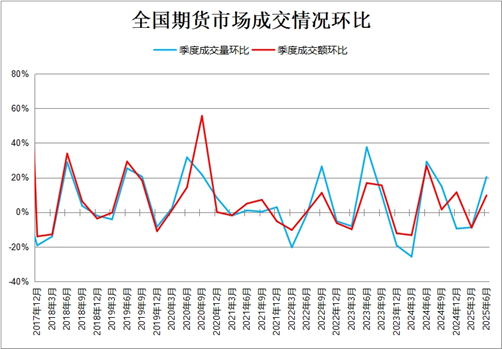 图:2017-2025年全国期货市场成交规模季度环比变化