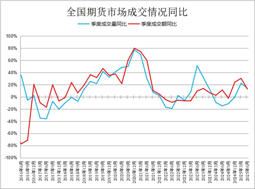 图:2017-2025年全国期货市场成交规模季度同比变化